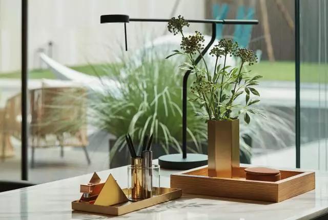 利用建筑層高優(yōu)勢,在沙盤區(qū)上方創(chuàng)造層次豐富、光影虛實(shí)變化的幾何造型,強(qiáng)化空間錯(cuò)落感。通過動(dòng)軸引伸便是洽談區(qū)。設(shè)計(jì)方案不希望洽談區(qū)和接待區(qū)域過于直接,通過造景形式將兩個(gè)空間自然串聯(lián)并分割開來。花藝在靜水面的映射下,光與影默契配合,有效避免了接待臺(tái)前的空曠,也營造出了整體空間的美學(xué)秩序。