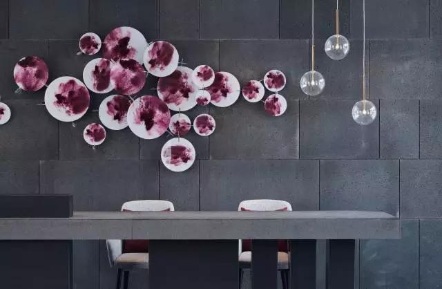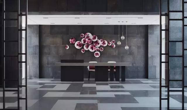 預(yù)接待吧臺(tái)與大廳講究整體的對稱平衡,通過巧妙的吧臺(tái)構(gòu)成形式、空間吊燈的位置,呈現(xiàn)靈動(dòng)的立面關(guān)系,有效緩解空間的呆板。大面積深灰色石材,配以紫色壁飾花瓣式鋪灑開來,夾雜一絲神秘感,東方韻味無限彌散。