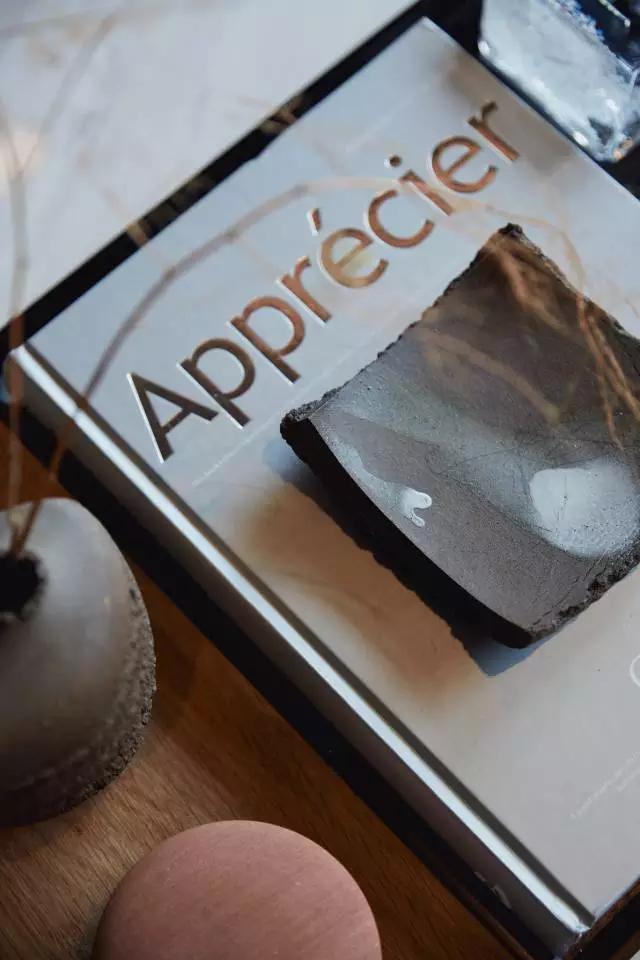 水吧臺(tái)以毛鑿面的形式呈現(xiàn),質(zhì)樸卻別具一格。而光線透射在吧臺(tái)頂面,又與書架、吊燈以及頂部的木百葉形成互動(dòng),勾勒出繽紛的空間輪廓。粗獷肌理感的石材,又與花瓣式的吊燈形成材質(zhì)上的鮮明對比,晶瑩璀璨。