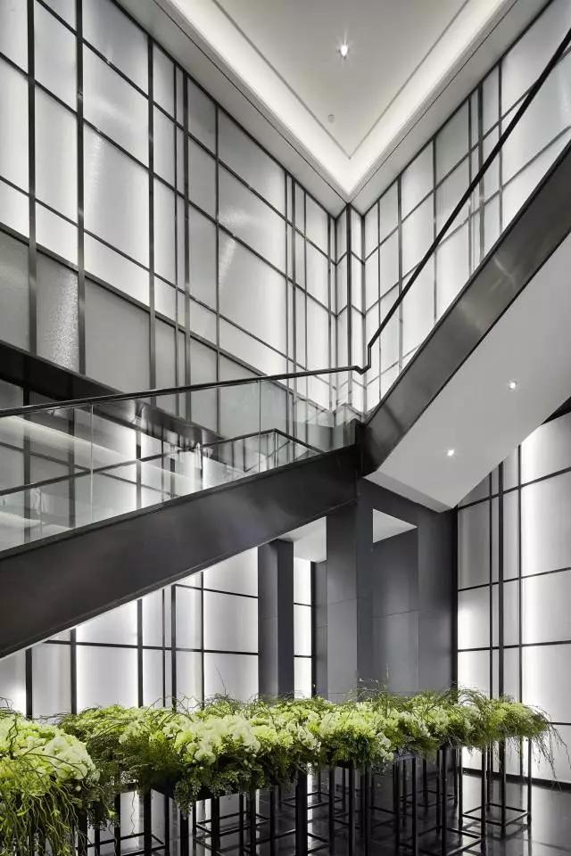 樓梯墻面引入“光線”的概念,設(shè)計上以簡潔的橫豎向線條元素構(gòu)成,結(jié)合原建筑結(jié)構(gòu),充分發(fā)掘空間內(nèi)的建筑感。