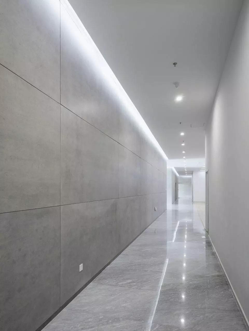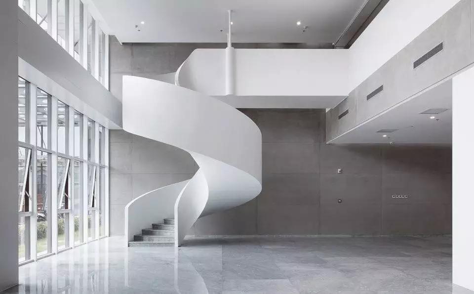 從中庭的自然光到室內的人工光,大廈的光影在豁然開朗和細致入微之中不斷變換。中庭必須和天空有所交流,尤其是霧霾肆虐的今天,藍天顯得特別稀有,在中庭上方加蓋玻璃幕墻為上策。流空素影正翩翻,使得存在于強烈靜態(tài)空間體驗中的人又能同時感受到光影與云卷云舒的動態(tài)變化。在典型的辦公樓層,小型私人會議室從中庭立面懸挑而出,并錯落有致,打破了中庭的單調,并增加了最小辦公空間的面積。一側的螺旋樓梯飄逸靈動,用混凝土演繹出的獨特輕薄感如風裳皎立,引辦公的人們靈感興發(fā)。