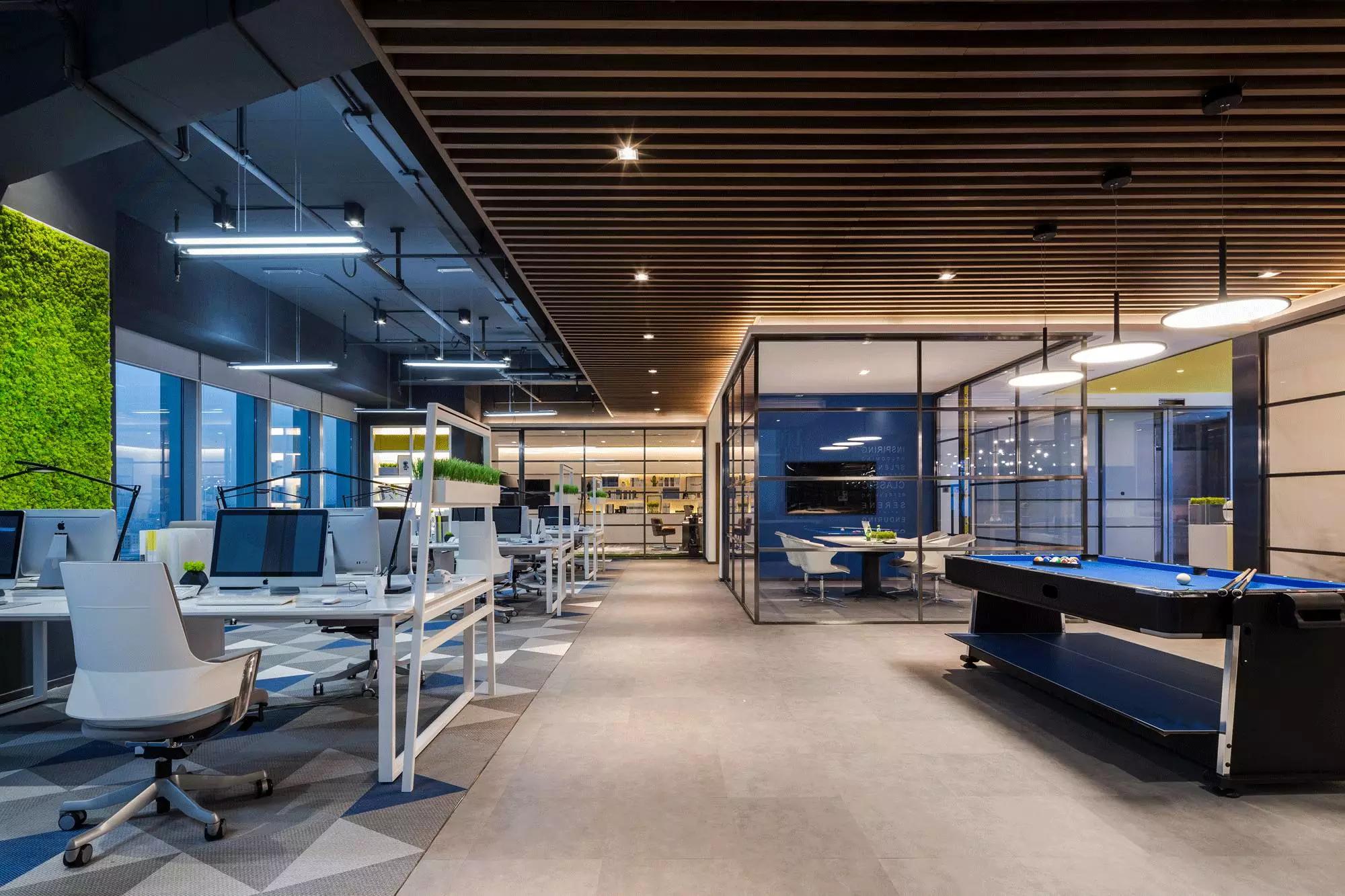 裸露的天花與木格柵的設(shè)計,形成反差,重點突出了原建筑的空間感,與時下設(shè)計熱點相適應(yīng);臺球的細節(jié)設(shè)計,體現(xiàn)了公司對員工精神層面上的關(guān)懷,工作之余,還可打一桿臺球放松身心。