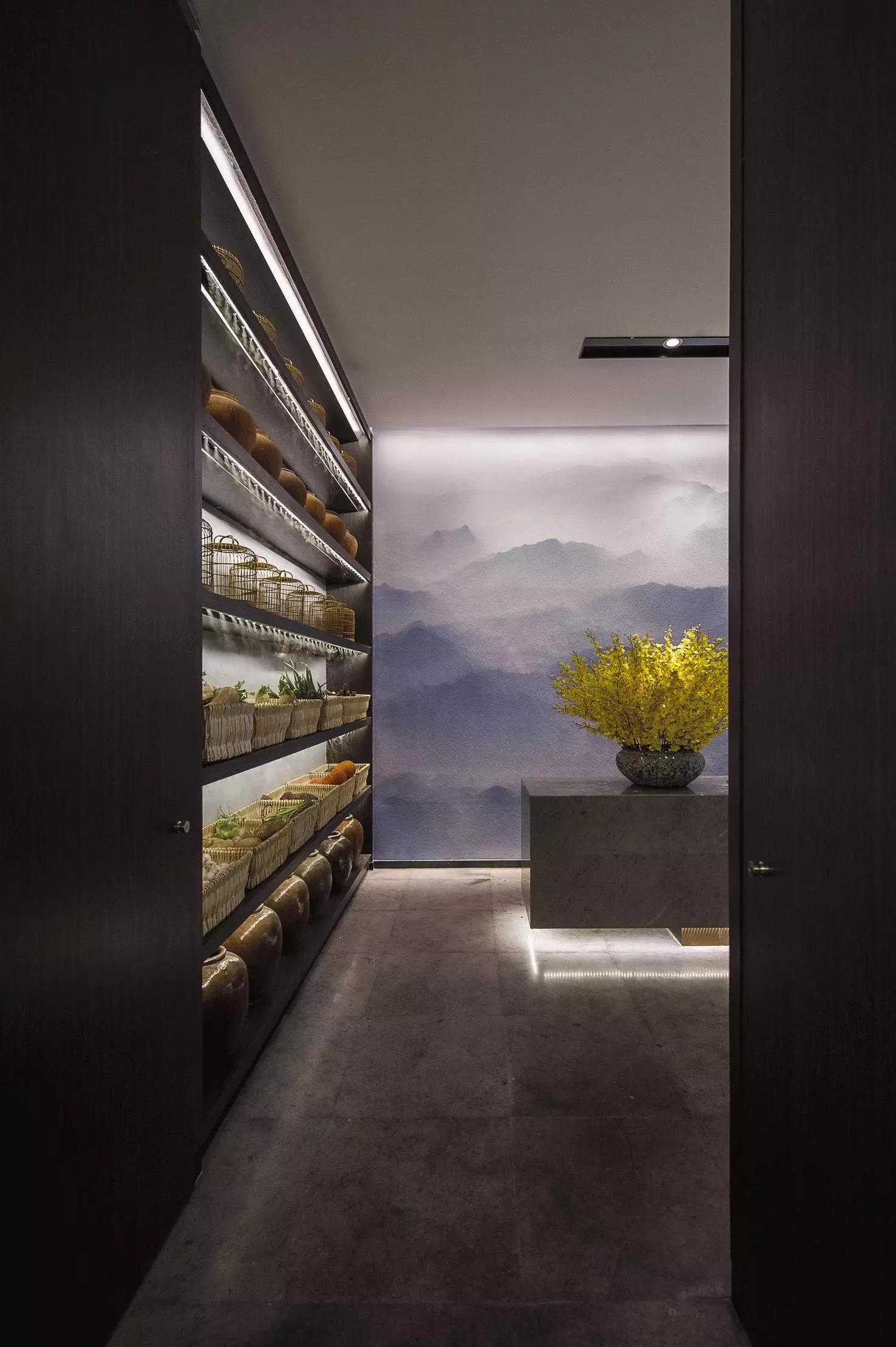 玻璃隔斷上的貼膜,在燈光的作用下恰似雕花窗欞,與另一邊的壁畫(huà)一虛一實(shí)相映成趣。氤氳的群山壁畫(huà),勾起對(duì)山海那邊,永遠(yuǎn)的家的思念。