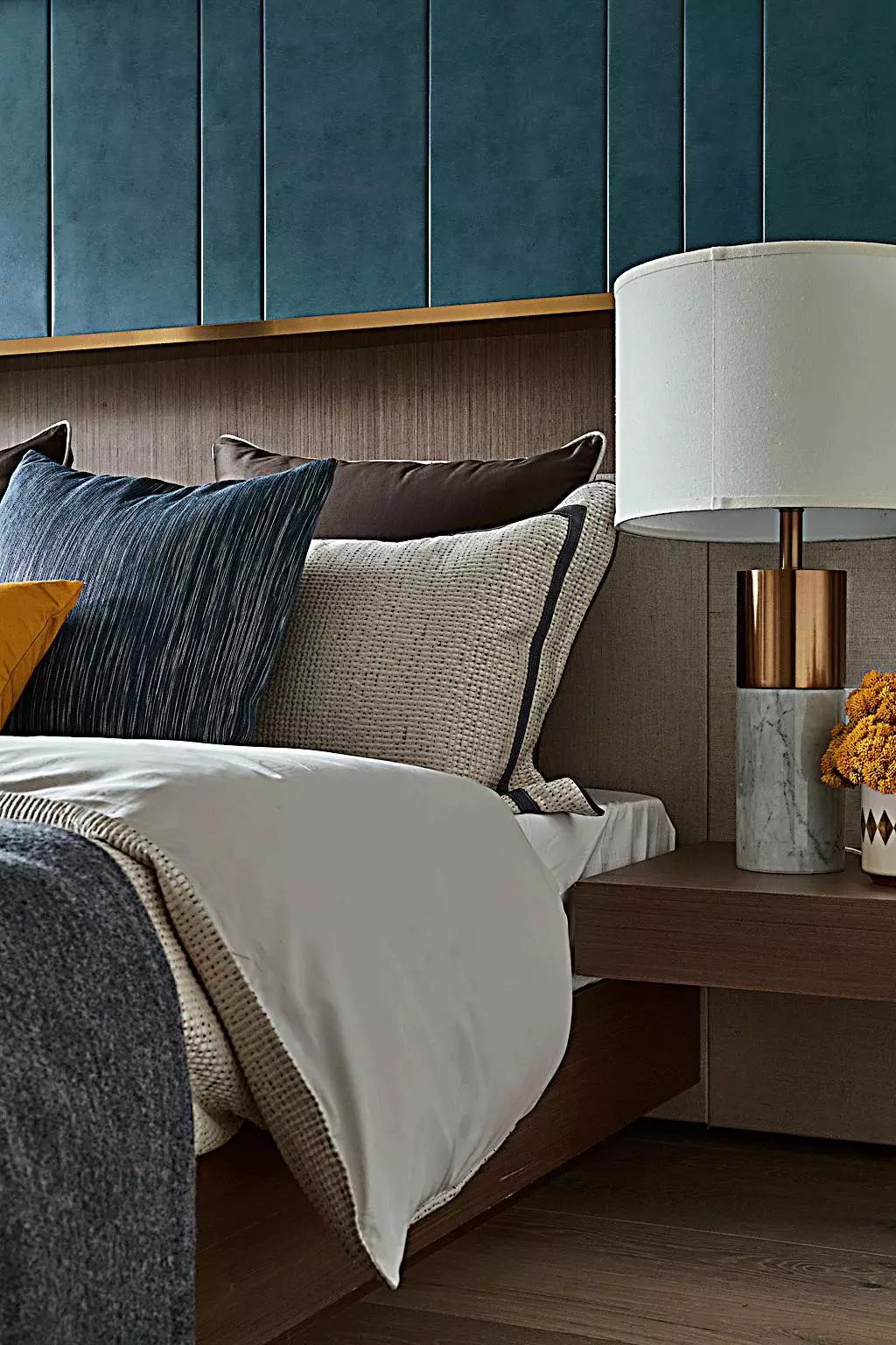 主臥,色彩沉穩(wěn)不失活力,黃銅和皮革造就空間的質(zhì)感,也如同雅痞們的堅(jiān)毅果敢、躊躇滿志。他們沒有頹廢情緒,一心追求奢侈舒適的生活。
