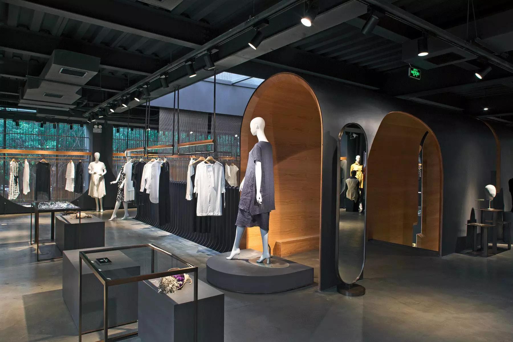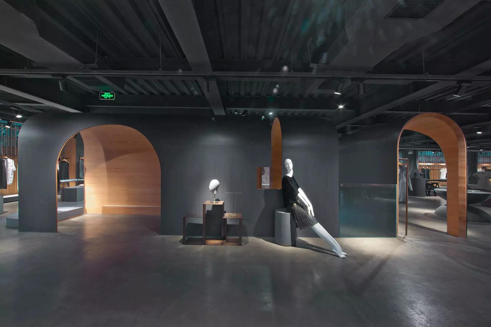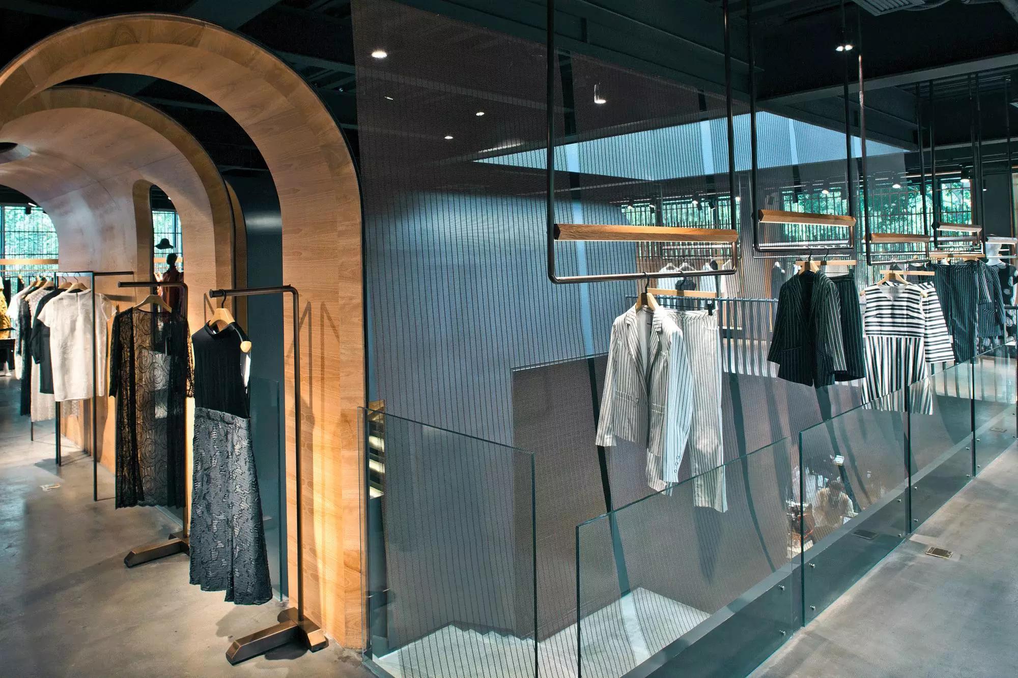 和一般常規(guī)服裝店陳列的概念不同,新的店鋪概念強(qiáng)調(diào)建筑化的零售模式。纖細(xì)的木屏風(fēng)結(jié)合貨架矗立在邊界處,渲染了空間和室內(nèi)飾面的豐富多樣性,建筑元素顯露材質(zhì)原始的質(zhì)感,烘托服裝的品質(zhì),這種手法為整個(gè)店鋪灌注純粹的氣氛,隱喻品牌的精神。天井樓梯釋放出不同光影效果,使整個(gè)空間與建筑取得一種時(shí)間與空間的對(duì)話。設(shè)計(jì)中,我們直白的將不同的“拱”垂直交疊,希望在垂直空間上制造不同的空間與體驗(yàn)。這個(gè)特殊的表現(xiàn)方式給人們提供強(qiáng)烈的視覺效果。依據(jù)商業(yè)需求,采用模塊式設(shè)計(jì),這樣可以使品牌不同功能具有最大的靈活性。