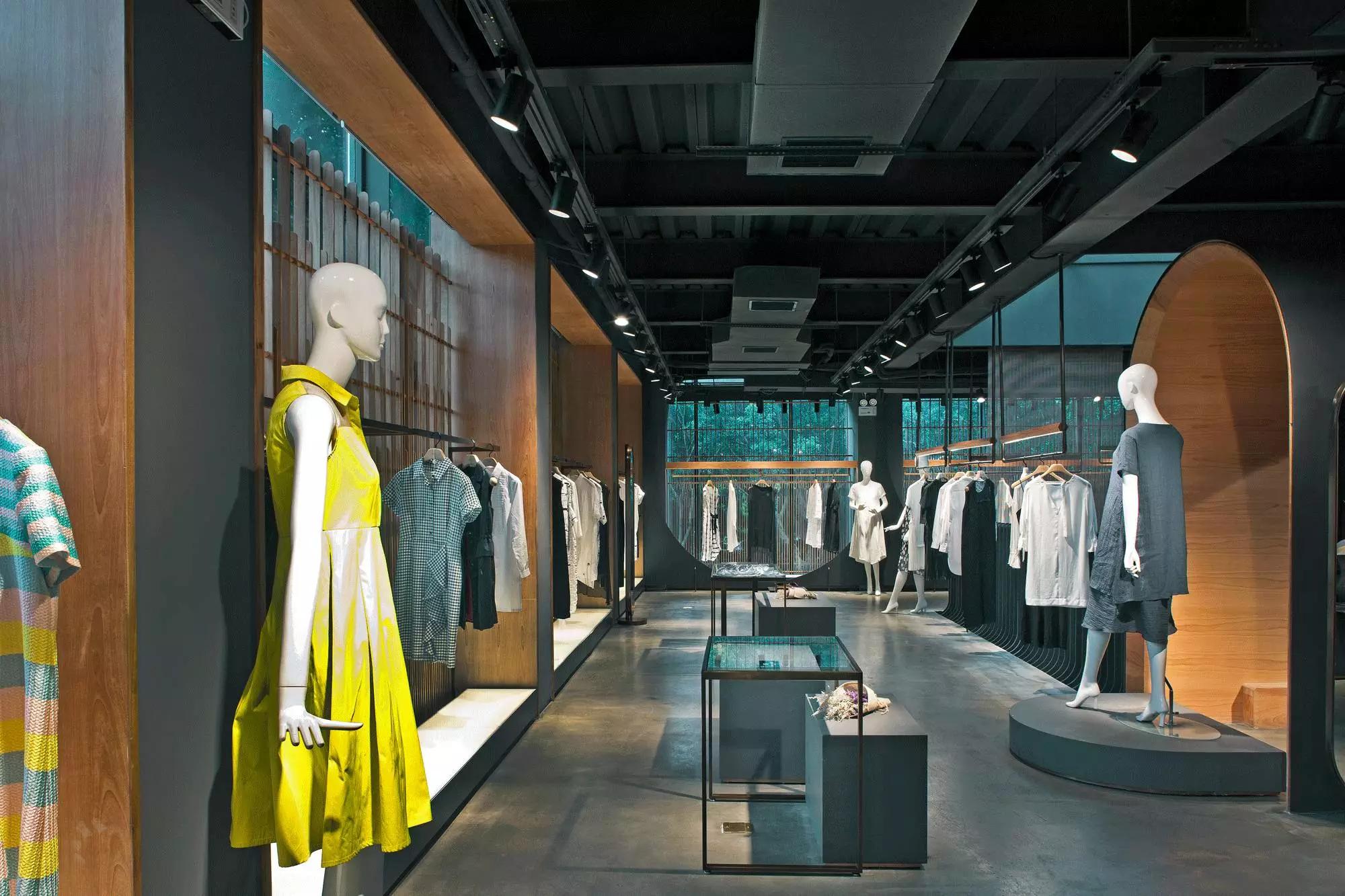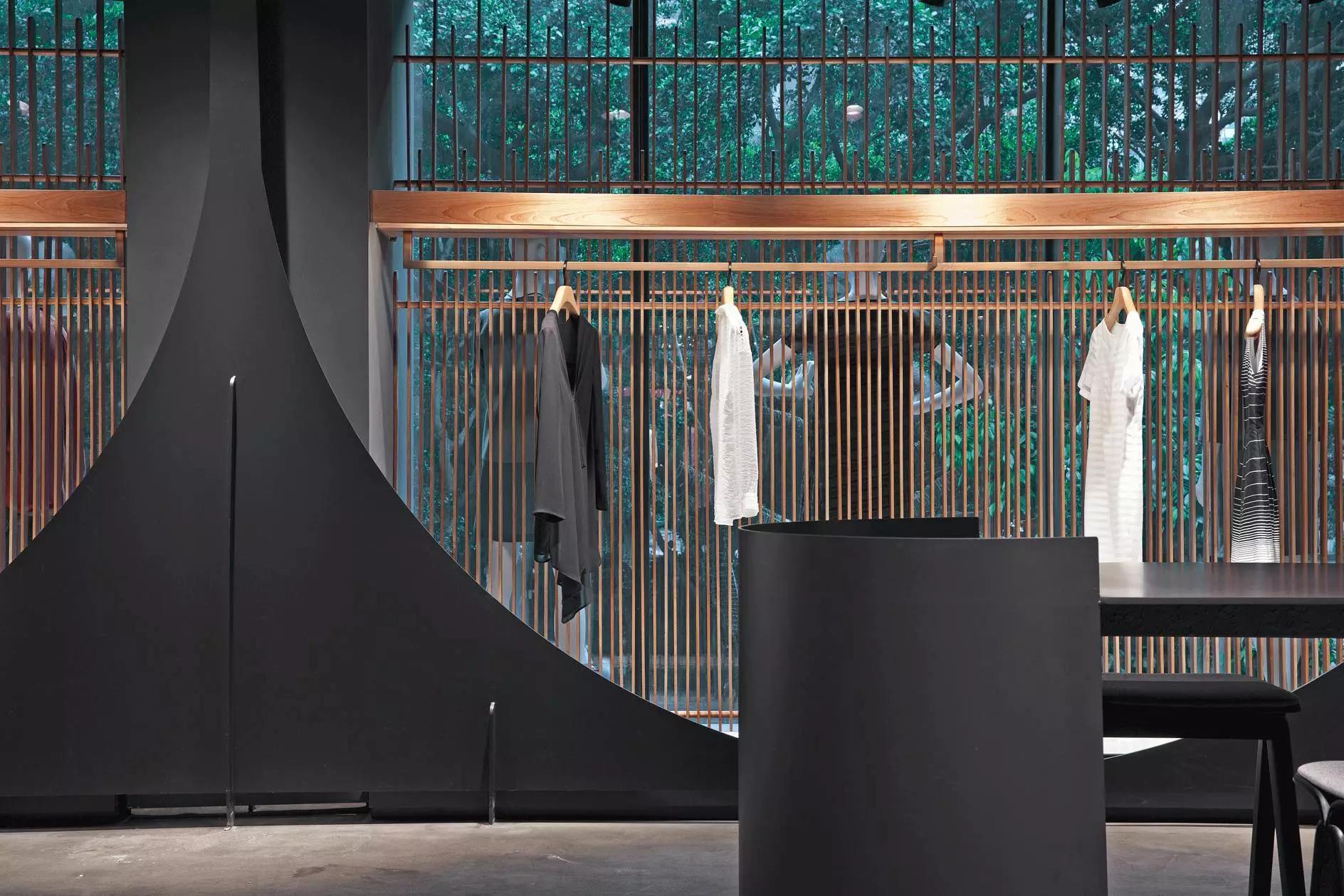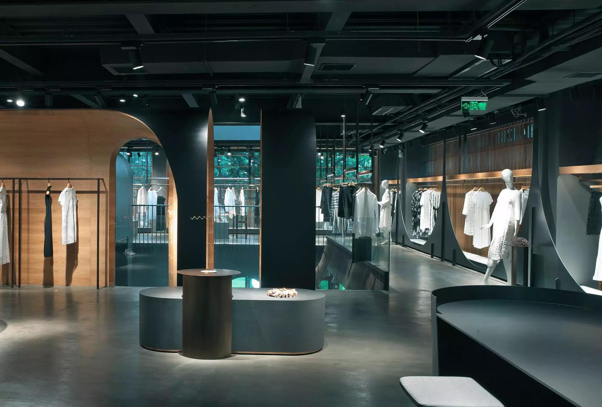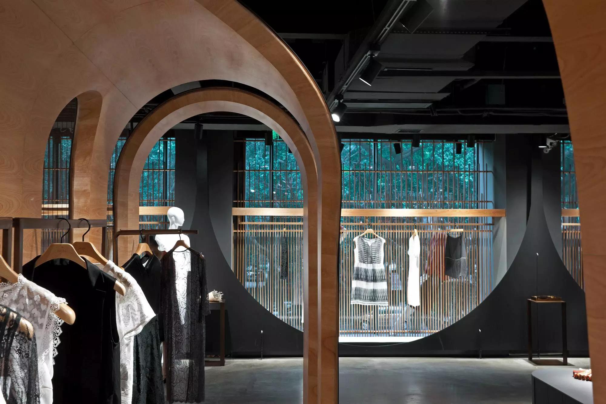 和一般常規(guī)服裝店陳列的概念不同,新的店鋪概念強(qiáng)調(diào)建筑化的零售模式。纖細(xì)的木屏風(fēng)結(jié)合貨架矗立在邊界處,渲染了空間和室內(nèi)飾面的豐富多樣性,建筑元素顯露材質(zhì)原始的質(zhì)感,烘托服裝的品質(zhì),這種手法為整個(gè)店鋪灌注純粹的氣氛,隱喻品牌的精神。天井樓梯釋放出不同光影效果,使整個(gè)空間與建筑取得一種時(shí)間與空間的對(duì)話。設(shè)計(jì)中,我們直白的將不同的“拱”垂直交疊,希望在垂直空間上制造不同的空間與體驗(yàn)。這個(gè)特殊的表現(xiàn)方式給人們提供強(qiáng)烈的視覺效果。依據(jù)商業(yè)需求,采用模塊式設(shè)計(jì),這樣可以使品牌不同功能具有最大的靈活性。