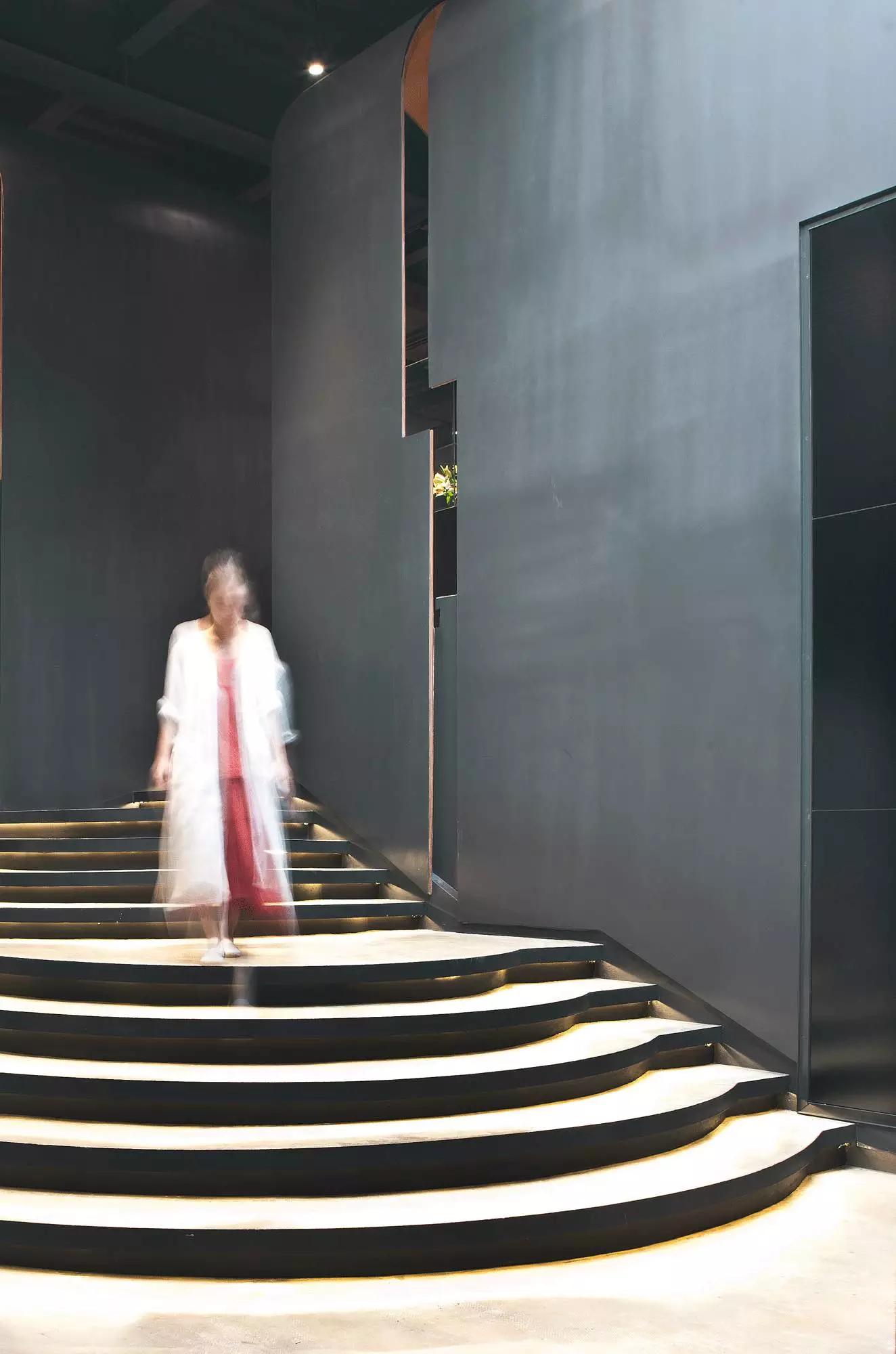 內(nèi)部空間希望呈現(xiàn)一種原始野性的魅力,采用鋼制的表皮帶來一種現(xiàn)實(shí)感。這種“直白”式的架構(gòu)材料,空間所形成的直接性與樸素性,加上大尺度的鋼板落地產(chǎn)生的力量感或輕盈感,使整個(gè)空間與原有場(chǎng)地建筑取得一種時(shí)間與空間的接續(xù)關(guān)系。利用“拱”多變的空間特性,產(chǎn)生不同的空間,打破了均質(zhì)的體驗(yàn)。這是一個(gè)回憶的過程,再一次將建筑的體量與空間對(duì)話,越是簡(jiǎn)單的形體邏輯,越能給人帶來深刻的印象,弧拱曲線柔和,呈現(xiàn)不同角度的美感?;」暗倪B續(xù)曲線把空間構(gòu)造成圍合區(qū)域,在這樣的方式下,內(nèi)部和外部保持著空間的連續(xù)性,這個(gè)理念使空間不拘泥于常規(guī),探索傳統(tǒng)類型空間的新秩序,"拱"在傳統(tǒng)建筑中扮演重要角色,并且在漫長的歷史中不斷豐富。我們?cè)噲D轉(zhuǎn)化傳統(tǒng)"拱",讓"拱"在均質(zhì)呆板的現(xiàn)代空間上制造新的突破,獲得自然能量并把它轉(zhuǎn)化為空間秩序。濃烈的空間美感,顯示該品牌的重要意義?;」巴臻g一、二層相連,創(chuàng)建出有趣的空間狀態(tài),吸引顧客的好奇心。